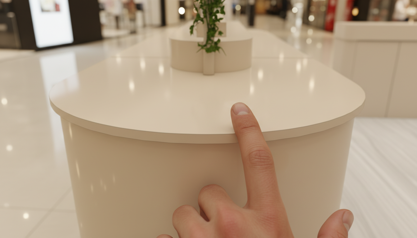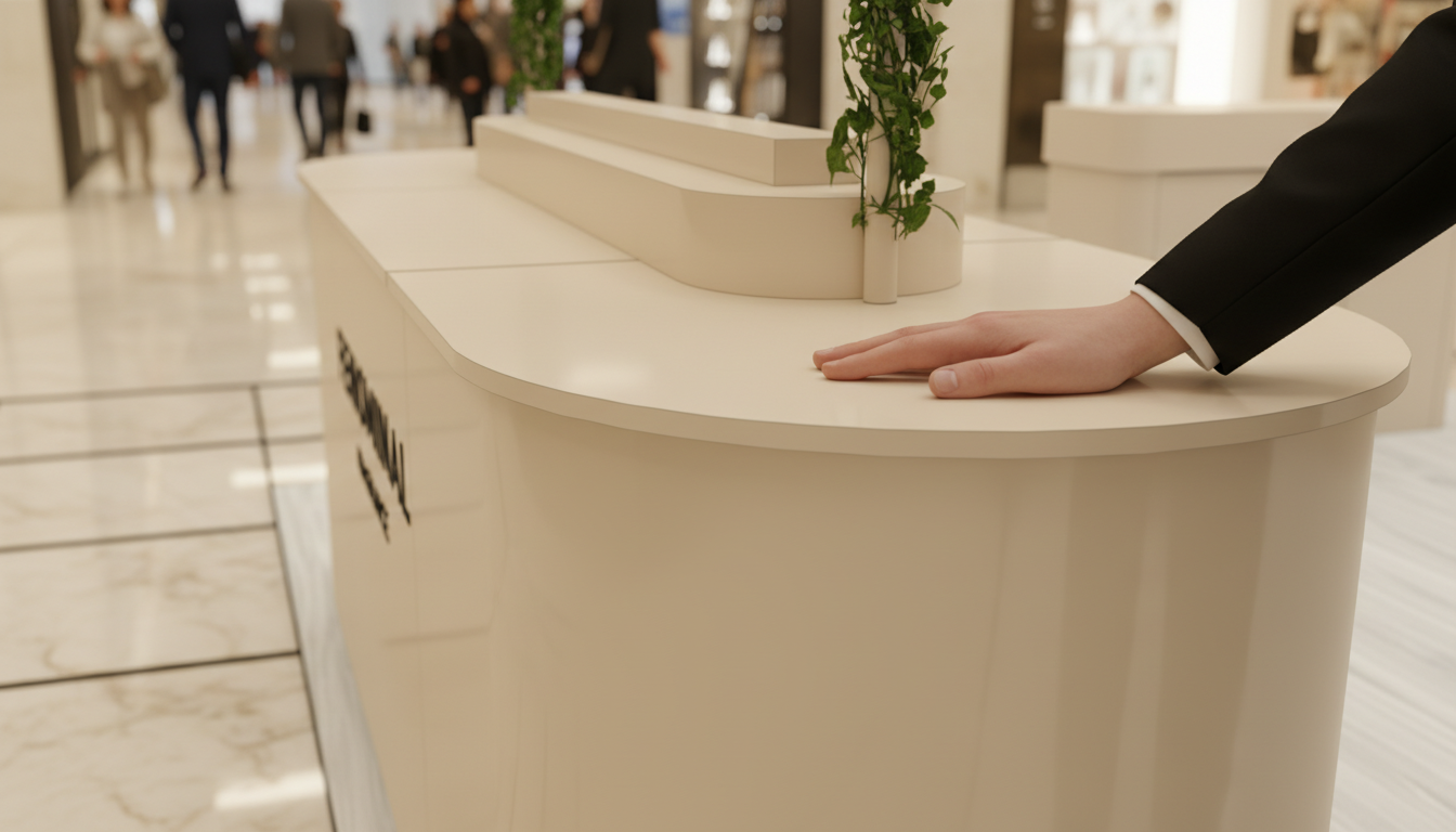 Standın merkezinde yer alan bankolara yüksek kaliteli lake uygulaması yaptık. Yüzeyleri pürüzsüz hale getirdik. Kenar dönüşlerini yumuşattık. Böylece ziyaretçiler hem görsel hem de dokunsal anlamda premium bir deneyim yaşadı. Aynı zamanda lake yüzeyler, alışveriş merkezi ışıkları altında güçlü bir yansıma oluşturdu. Bu yansıma markanın lüks algısını pekiştirdi.