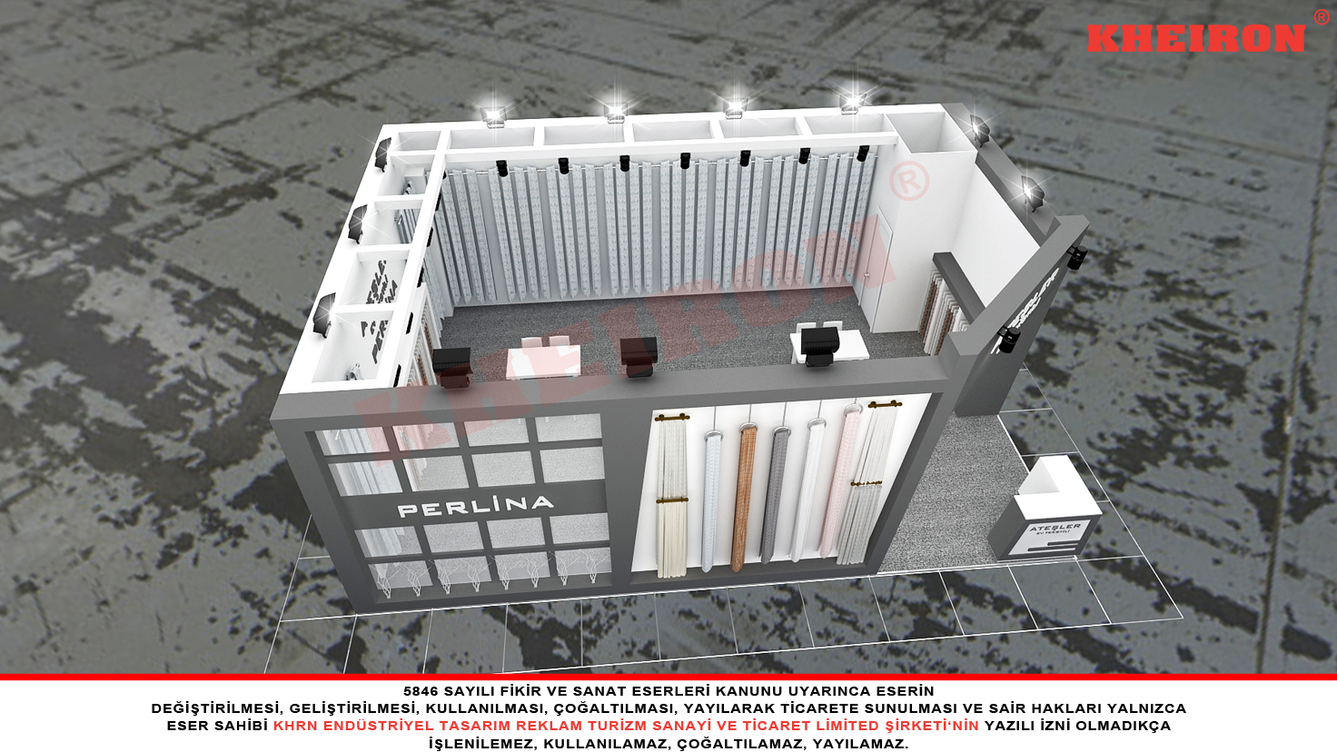 Bu nedenle tasarım öncesi hazırlıklarda bu konuya dikkat edildi. Kartela boyutları ile beraber showroomlardaki teşhir şekli öğrenildi. Oldukça basit ve uygun maliyetli bir çözüm sunuldu. Bu sayede müşterinin fuarda, mümkün olduğunca fazla ürün teşhir etmesi hedeflendi. Stand tasarımları hazırlık aşamasında, bu bilgileri almak önemlidir.