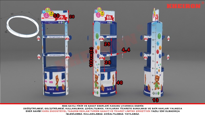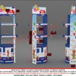 - Toplam iki adet raf kullanımı sağladığımız bu stantta raflar, enjeksiyon tekniği ile oluşturulmuştur. Raf önlerinde kullandığımız wobbler (kağıda basılmış reklam öğesi) ile görsel açıdan tatmin edici bir görünüme kavuşturduk. Ayrıca raf önlerinde bulunan raf siperlikler ile teşhir edilecek ürünlerin stant üzerindeki tutuşunu arttırdık. Bu sayede kozmetik sektörüne ait en ufak ürünlerin sergilenmesi bile kolaylaştı.
