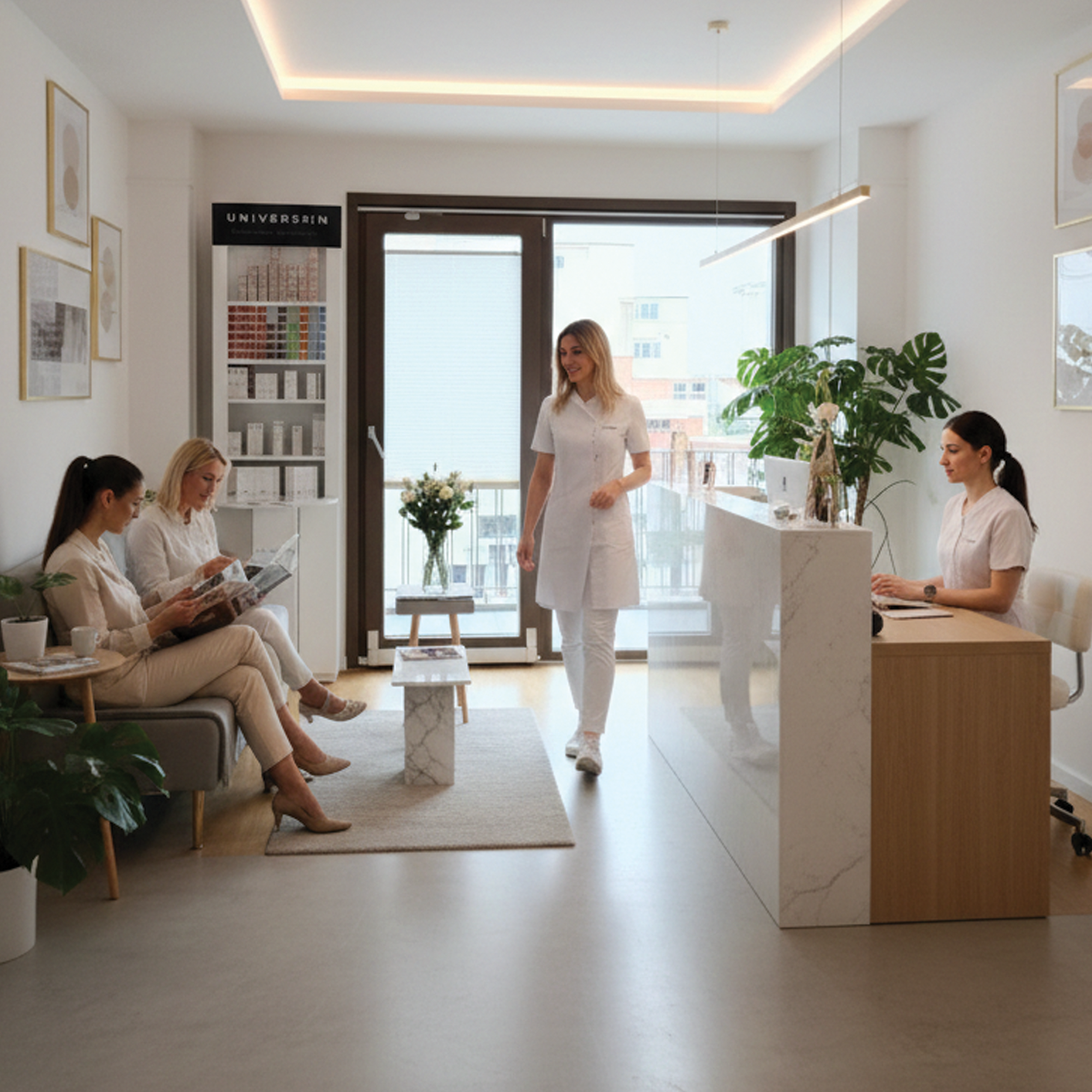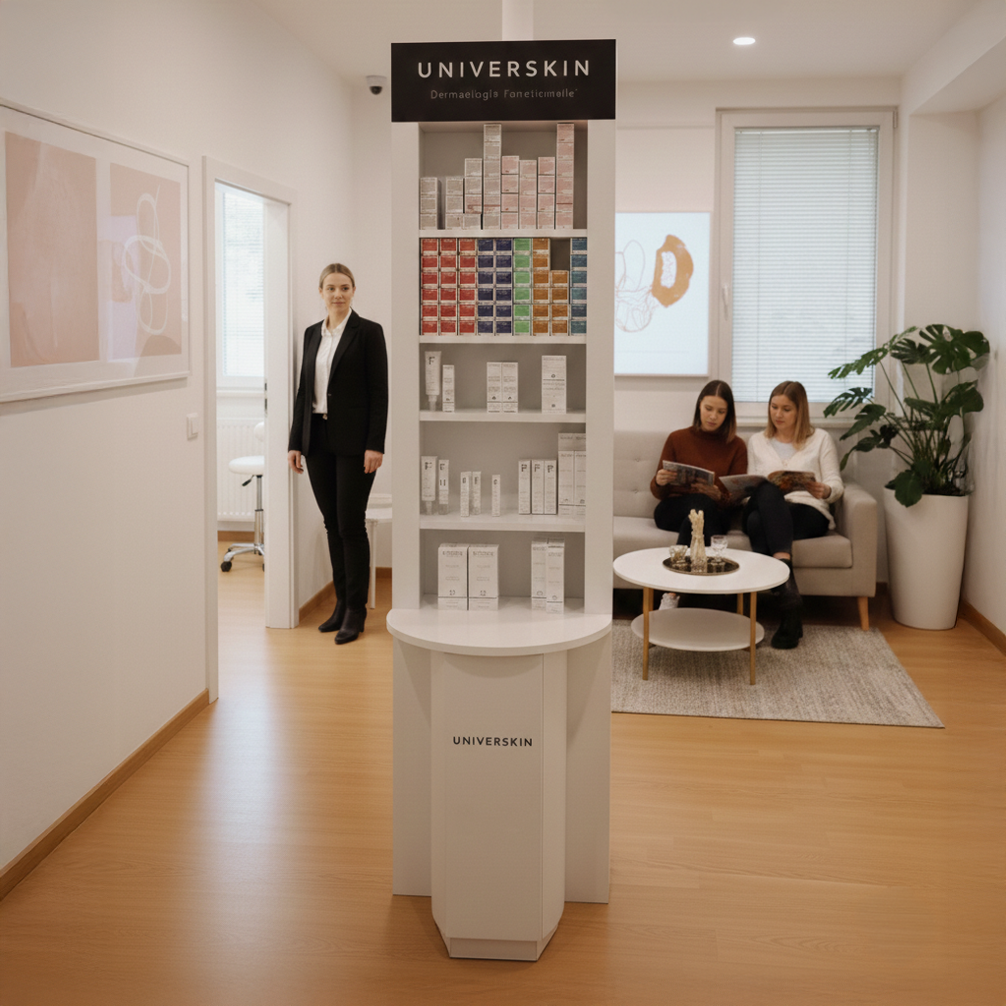 UniverSkin ürünleri renkli ambalajlarla öne çıkar. Bu ambalajlar stand üzerinde güçlü bir görsel etki yaratır. Ahşap zemin renkleri daha belirgin gösterir. Pleksi seperatörler düzeni destekler. Ürün grupları net biçimdedir. Müşteri aradığı ürünü kolayca seçer. Böylece raf önünde kararsızlık azalır.