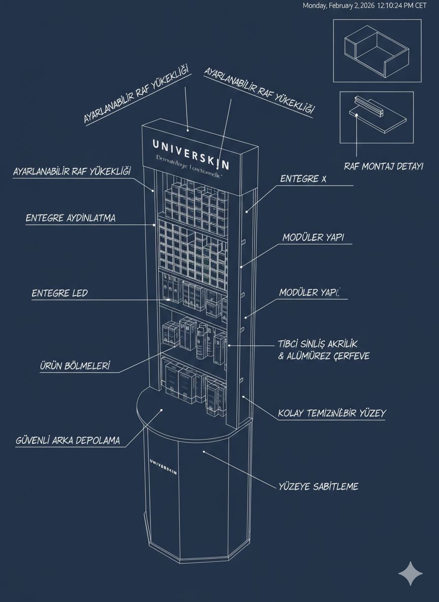 UniverSkin Depolu Ahşap Stand, eczanelerde satış gücünü artırmak için tasarlanır. KheironStand bu üründe teşhir, hız ve düzen kavramlarını aynı noktada birleştirir. Stand, ürünü sıradan raftan çıkarır. Ürünü merkeze taşır. Böylece müşteri ürünü daha hızlı fark eder. Ayrıca marka algısı artar. Ahşap gövde sıcak bir etki yaratır. Beyaz yüzeyler hijyen algısını yükseltir. Pleksi detaylar profesyonel bir görünüm kazandırır. Bununla beraber stand, modern eczane tasarımlarına kusursuz uyum sağlar. Ayrıca, ürünü tam incelemek istiyorsanız, üstteki ana renderdan çok metnin sonundaki görselleri inceleyin.